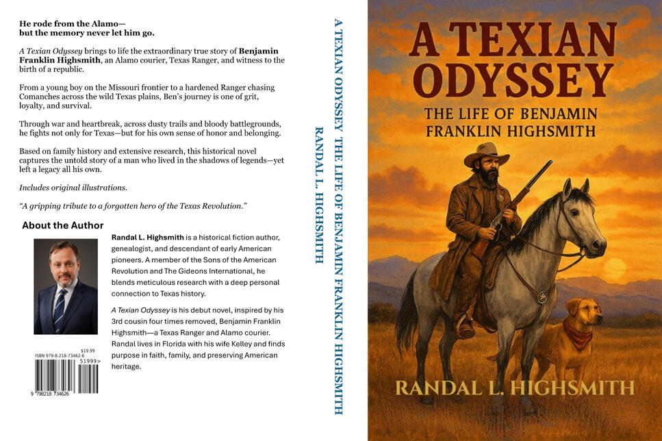 âď¸ By Randal L. HighsmithWhen writing A Texian Odyssey, I wanted to honor the real history of Benjamin Franklin Highsmith (1817â1905), a distant cousin in my family tree, while also weaving a compelling story that captured the spirit of the Texas frontier. Like Laura Ingalls Wilderâs Little House series or Earl Hamner Jr.âs The Waltons, my novel blends documented history with narrative imagination.Here is a guide to what is historically verified and what has been fictionalized for storytelling purposes.Early Life & MigrationHistory: Ben was born in 1817 in Troy, Missouri. In 1823, the Highsmiths, Turners, and Sowells moved to Texas as part of Stephen F. Austinâs colony.In the Novel: The journey is expanded with campfire scenes, family storytelling, and hardships on the road. Benâs father, Ahijah, delivers memorable sayings such as âA manâs word ought to weigh more than his rifle.â These are fictional but reflect the moral wisdom of frontier life.The Alamo & the Texas RevolutionHistory: Benjamin Franklin Highsmith, a distant cousin in my family tree, carried William B. Travisâs message from the Alamo to seek reinforcements. He survived because of this mission.In the Novel: The ride is dramatized, with Ben looking back at the Alamo in anguish. I also created a fictional reunion with Joe, Travisâs enslaved man, after San Jacinto â a way to reflect on survival, memory, and witness.Religious FaithHistory: No baptismal record has been found for April 1836, though it is plausible. Ben lived in a time when survival often deepened a pioneerâs faith.In the Novel: I added a river baptism after San Jacinto as a symbolic moment of rebirth, gratitude, and faith. Itâs interpretive, not documented, but consistent with the spiritual practices of that era.Rangers & Frontier ConflictsHistory: Ben served as a Texas Ranger and took part in campaigns at Nueces Canyon, Enchanted Rock, and the Pinta Trail.In the Novel: These conflicts are fleshed out into full chapters with dialogue, suspense, and tactical detail, making them turning points in Benâs development as a Ranger.Uncle Samuel HighsmithHistory: Samuel Highsmith served as a Ranger, wore a Mexican uniform taken as a trophy (tintype dated 1836), tried hog farming in Jackson County, returned to Ranger life in 1840, and died in 1849 in San Antonio.In the Novel: Samuel is given richer character depth: his tintype moment with his son Malcijah, the hog farm struggles, and his final resting place in San Antonioâs first Protestant cemetery are shown through Benâs eyes.Family, Love & LossHistory: Ben married Mary Jane Gray around 1841, though they had no known children. He married Elizabeth Turner in 1853, and together they raised thirteen children. Several died young, while others carried the Highsmith name into New Mexico, Texas, and beyond.In the Novel: The marriages are dramatized, with romance, vows under the live oaks, and family unity emphasized. The children are given fuller personalities, and the losses are written as poignant, emotional turning points.Bart the Mustang & Bowie the DogHistory: There is no record of Ben having a horse named Bart or a dog named Bowie.In the Novel: Bart and Bowie are fictional companions, representing loyalty, freedom, and the ties between man and beast on the frontier. Their deaths parallel key moments of loss in Benâs life, deepening the emotional impact of the story.Civil War YearsHistory: Benâs kin fought for the Confederacy. He appears in records as a farmer during this time.In the Novel: The era is expanded into moral struggles, farming hardships, and scenes of family prayer, showing how Ben kept his household steady during divided times.Final Years & LegacyHistory: Ben lived until 1905, passing away in Uvalde, Texas. In 1936, during the Texas Centennial, the State of Texas honored him with a dedicated headstone.In the Novel: The epilogue reflects on his long life as a Ranger, Texian, husband, and father. His story closes not only as history but as legacy â one remembered by descendants and tied to the larger American journey from the Mayflower to the Texas frontier.Why Blend Fact & Fiction?The goal of this novel was never to write a textbook. It was to bring history to life â to imagine what Benjamin Franklin Highsmith, my distant cousin, might have felt, feared, or prayed for. Where records are clear, Iâve stayed true to them. Where history is silent, Iâve filled the gaps with stories rooted in faith, family, and frontier resilience.